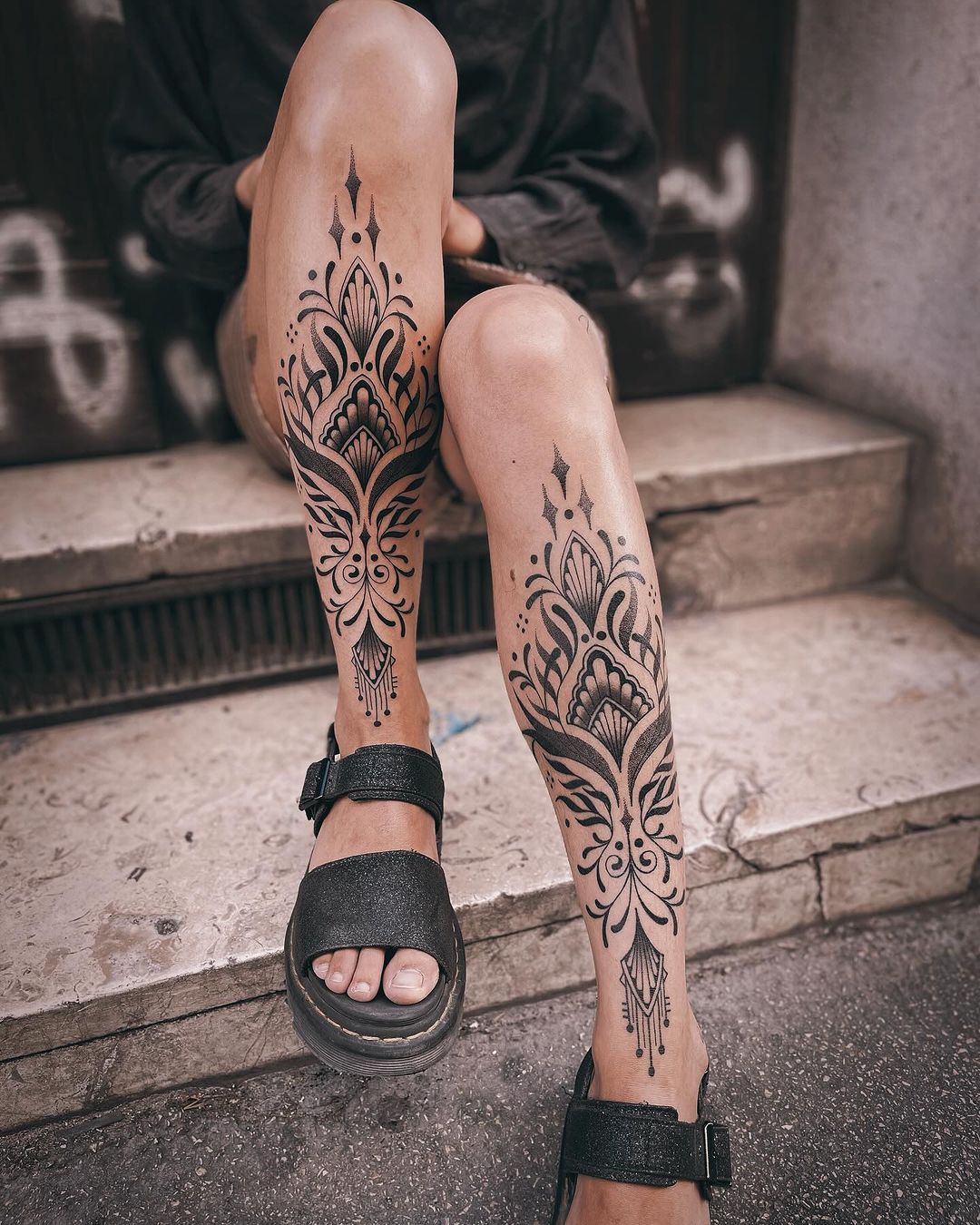Matching Mandala patterns on both shins create this beautifully balanced look. The Symmetrical placement feels intentional and calming, almost meditative. It’s decorative but grounded—the kind of Ornamental work that feels like wearable architecture.