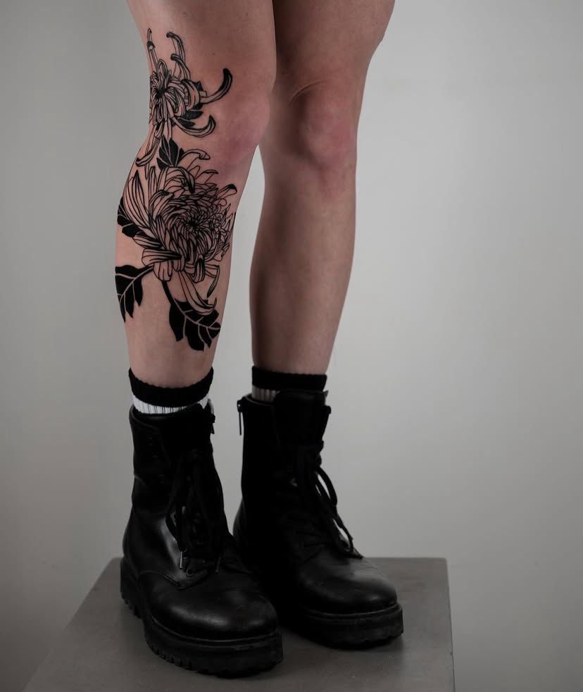 This deep black Floral composition has a moody elegance. The chrysanthemum petals feel layered and dramatic, almost like fabric folds carved into the skin. It’s striking in its simplicity—no color, no distraction, just strong lines and confident placement along the shin.
