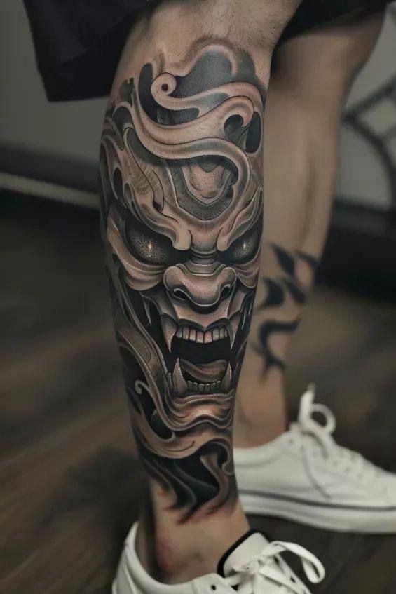 A fierce Japanese oni mask wrapping the shin has this undeniable intensity. It’s dramatic, powerful, and honestly a little mesmerizing. The way the shading hugs the muscle gives it that almost sculpted effect—like the art is alive. This kind of sleeve placement doesn’t whisper; it speaks confidently. You feel it when you walk into a room.