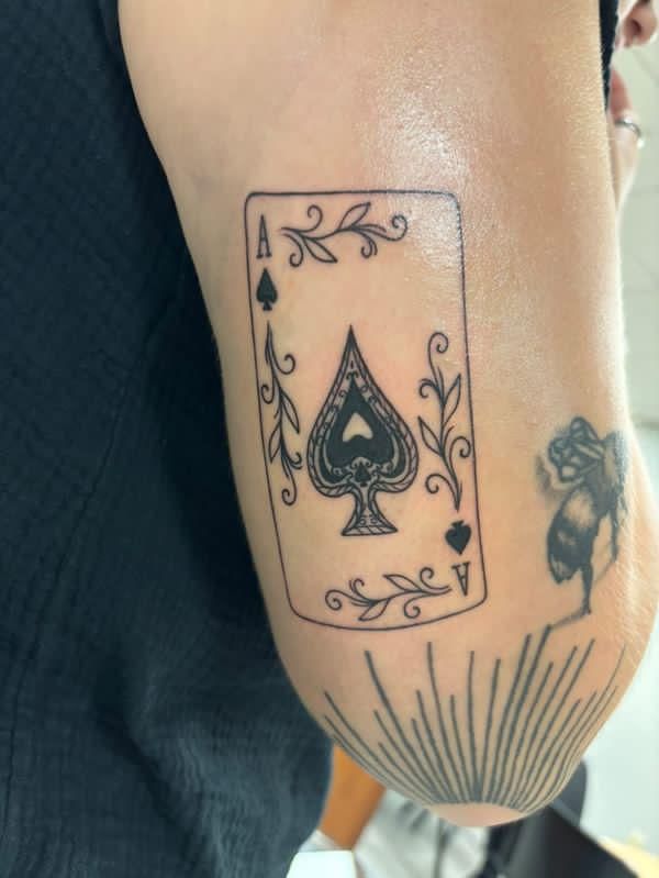 Compared with a simple outline spade, this design adds dimension and storytelling. The shading creates movement and makes the tattoo feel alive, while the card angle adds visual interest. If you want something less predictable than traditional ace tattoos, this idea delivers a creative twist.