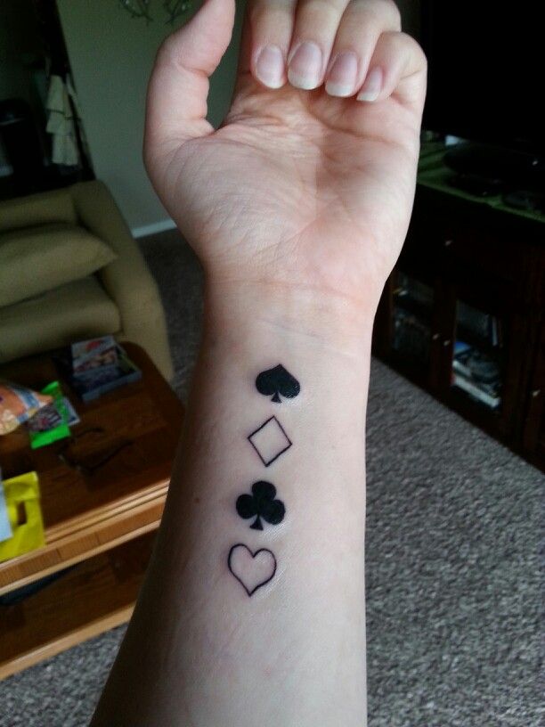 A vertical lineup of card suits creates a playful and balanced tattoo that feels both symbolic and stylish. The spade leading the sequence gives the design a strong focal point, while the other suits add harmony and storytelling. It has a relaxed, almost lucky-charm feeling that makes it fun and meaningful at the same time.