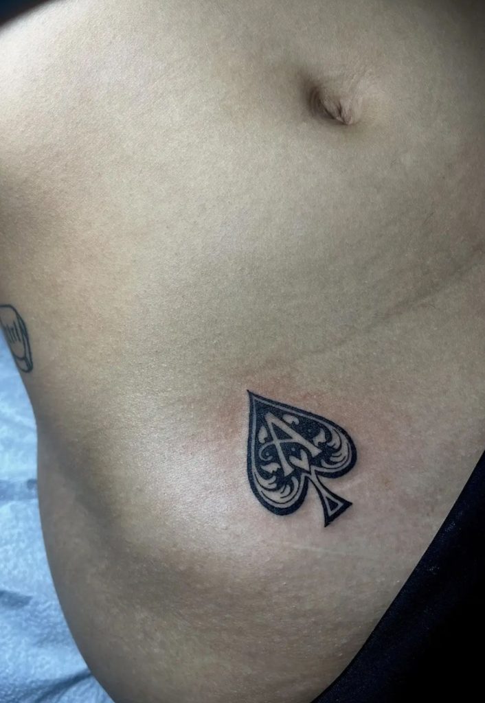 There’s something undeniably confident about a detailed Ace of spades tattoo placed low on the torso—it feels intentional, personal, and quietly bold. The swirling interior lines soften the sharp edges of the spade shape, turning a classic card symbol into a decorative design that feels both elegant and strong. It has that rare balance between toughness and beauty, making it feel like a private symbol of luck and individuality.
