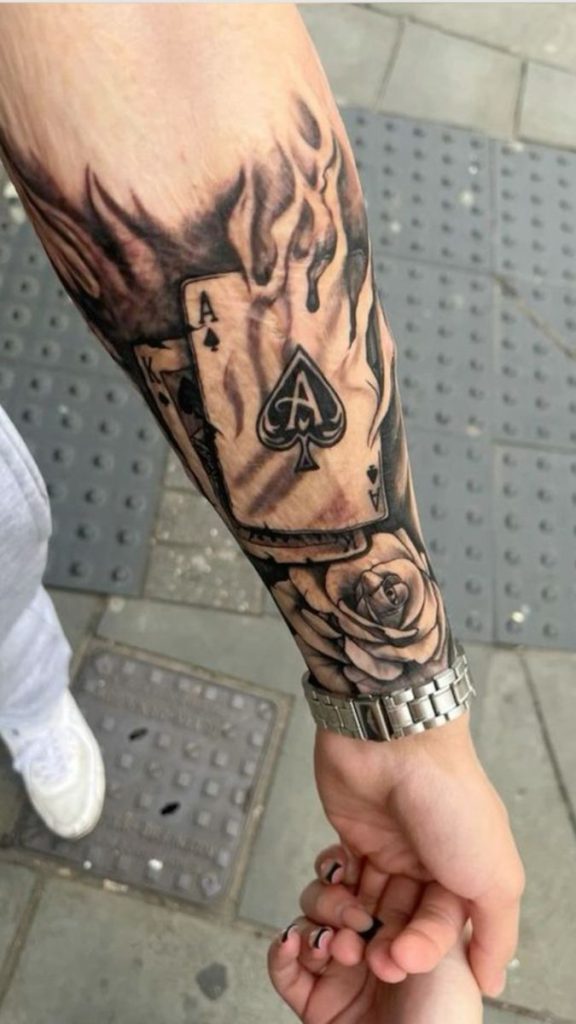 A tattoo of a tattooed hand holding a fan of aces feels layered and expressive, like a story told through symbols. The spade card naturally draws the eye, while the jewelry and ink details give the design a personal and slightly rebellious personality. It feels bold and artistic, perfect for someone who sees tattoos as part of their identity.