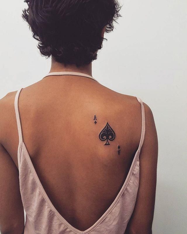 A small spade tattoo placed along the upper back has a quiet elegance that feels incredibly personal. It doesn’t demand attention, yet it always looks intentional—like a subtle signature rather than a statement piece. The delicate size makes it feel refined and stylish, perfect for someone who prefers understated symbolism.