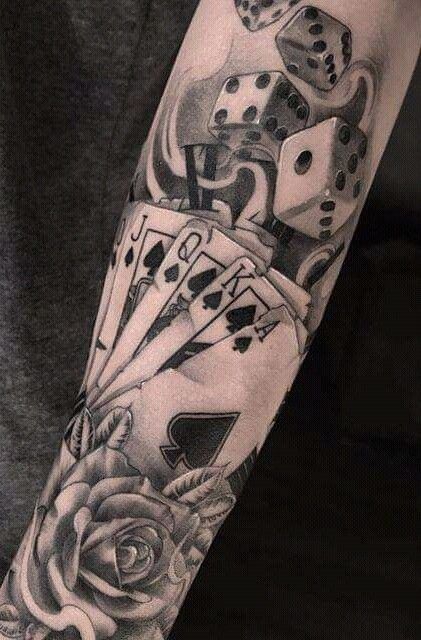 This lively tattoo blends playing cards and dice into a flowing composition that feels dynamic and energetic. The spade symbol anchors the design while the surrounding elements create movement and depth. It captures the excitement of chance and the thrill of risk in a way that feels expressive and personal.
