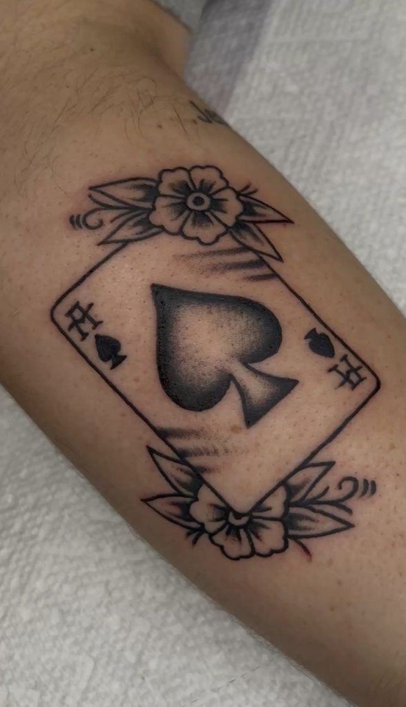 A floral Ace of spades tattoo brings a softer side to a traditionally bold symbol. The flowers wrapped around the card create a gentle contrast that feels artistic and expressive, blending strength with a sense of personal style. It feels romantic without losing the confident edge that makes spade tattoos so appealing.