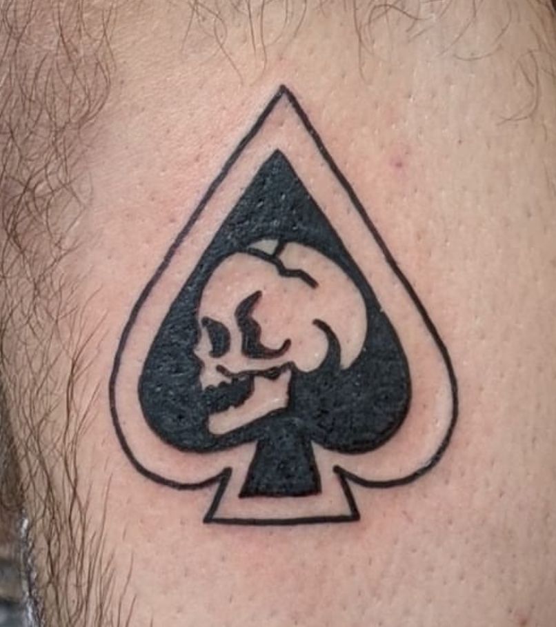 This flowing spade tattoo feels artistic and personal, almost like a signature drawn in ink. The curved lines soften the traditional spade silhouette, giving it a graceful look that feels more expressive than geometric. It has a quiet charm that makes it feel unique without being complicated.