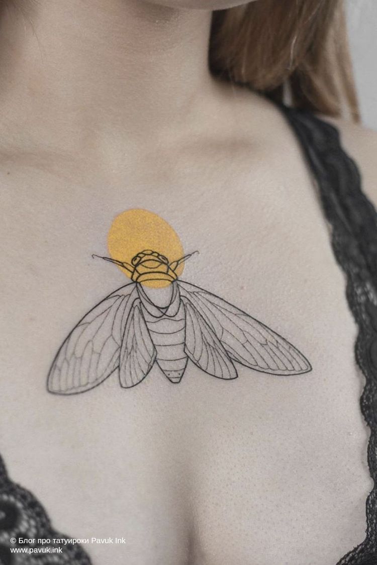 Nothing is more hauntingly beautiful than simplicity, and this cicada tattoo is an example of this. Thin black lines match with a soft circle of color above the insect to create an almost celestial glow. A meditative feeling is created, like a quiet whisper that reminds you of life’s cycles and rebirth. Put on the chest; it emanates strength and vulnerability-all at once-an intimate design that is both bold and understated.