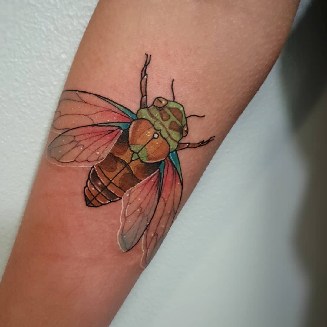 After vibrant greens and purples, this cicada tattoo has in it the punch of old-school American tradition. The thick outlines, heavy color palette, and party attitude give this insect an almost supernatural edge. It is a bit dramatic, playful, and loudly eye-catching-right up the alley of someone having fun with personality in their tattoos.