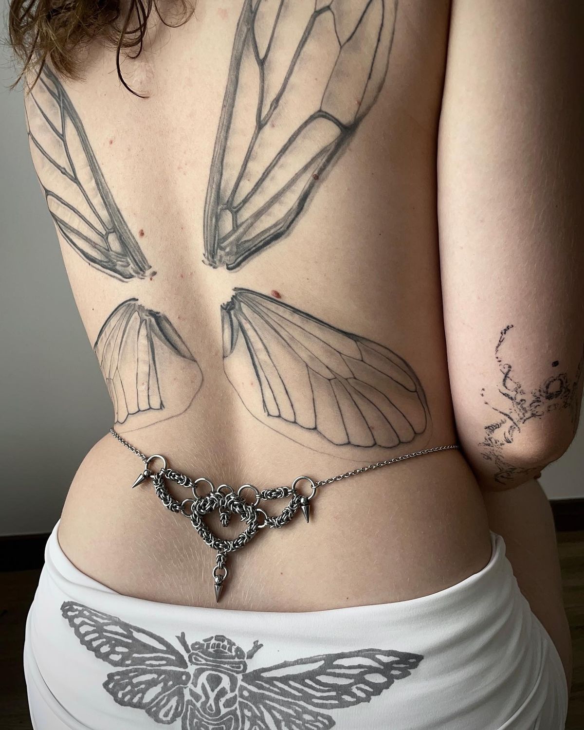 The breathtaking full back cicada wing tattoo concentrates solely on the wings instead of the insect so that they spread across the shoulder blades like a set of ethereal armor. It speaks of strength and transformation and does so in a soft and airy tone, as if the wearer is set to take flight at any moment.