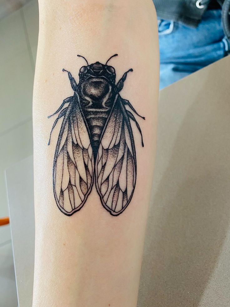 The bold cicada tattoo leans heavily and boldly with black shading and intricate wing detail to claim a dominating presence. It is not subtle or ephemeral; it is strong and earthy, filled with intensity. These dark fills are dramatic and edgy, that kind of tattoo that screams confidence.
