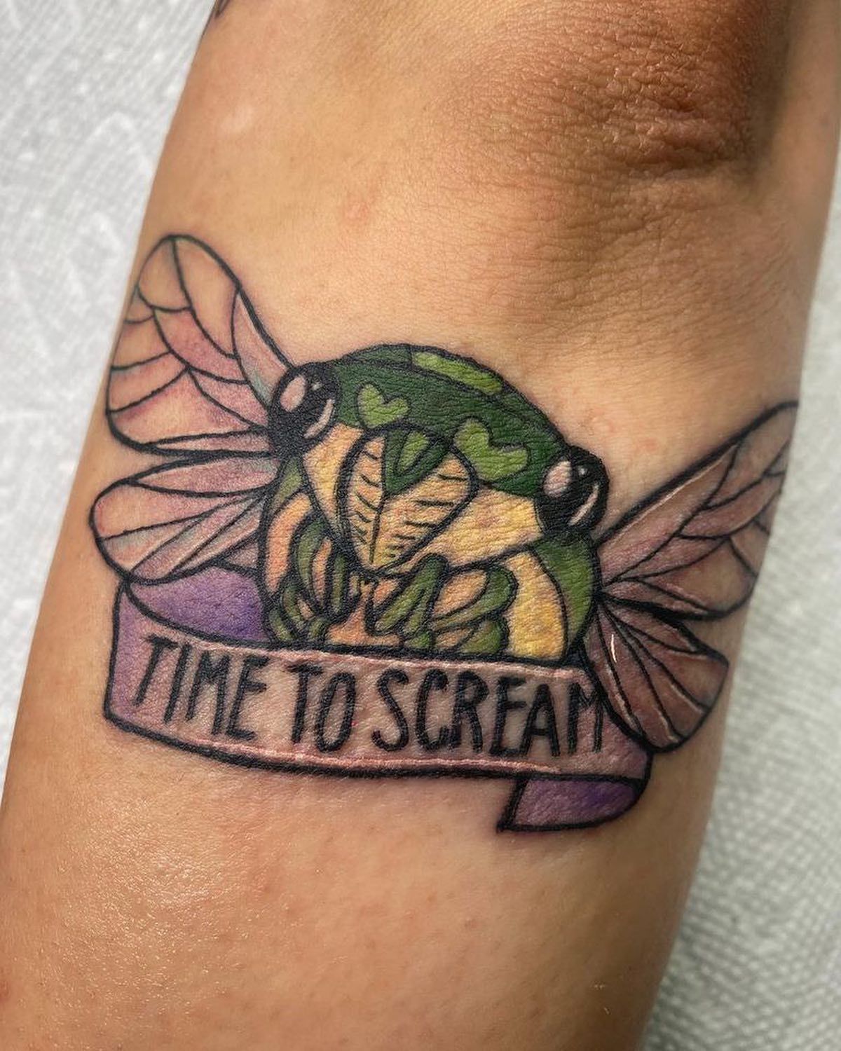 Here, the charming cicada tattoo works with an amusing banner stating, “Time to Scream,” in a whimsical manner. Light-hearted and cheeky tattoo culture proves that humor can be found in symbolism; indeed, the pastel greens and pinks further add molten fun and the spirit of approachability.