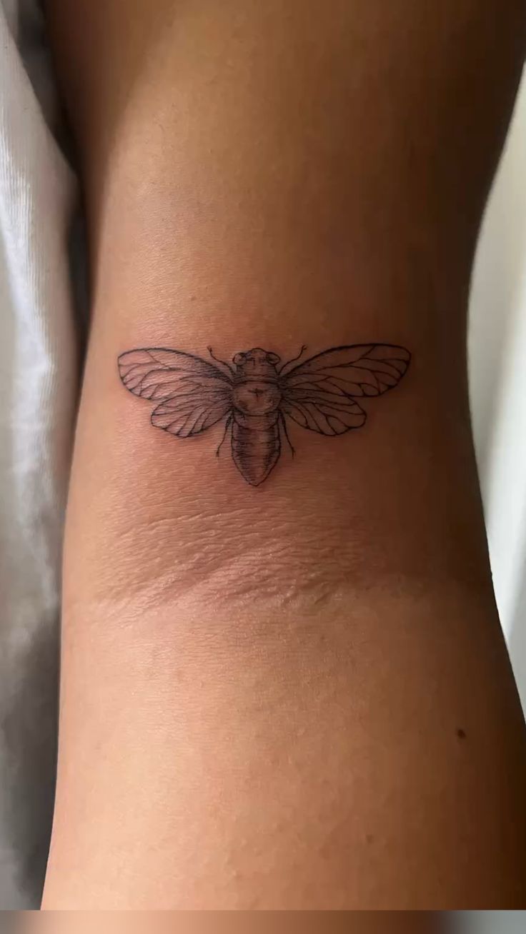 Small and delicate but precise—the tiny cicada tattoo has a quiet beauty that captures the imagination instantly. Its fine lines give it a light, breezy feel, while the placement near the ankle lends it to an aura of quiet intimacy. It is subtle yet symbolistic, almost like a private emblem of transformation one keeps for oneself.
