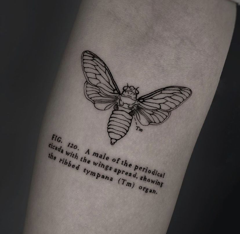 This feels like a piece lifted right out of an old biology textbook. The fine-lined cicada drawing with some accompanying text carries that vintage scientific aura. It is thoughtful and precise, and it makes one look like a collector of knowledge as much as an artist. It is the kind of design that is simple and elegant yet quietly darker with an intellectual edge.