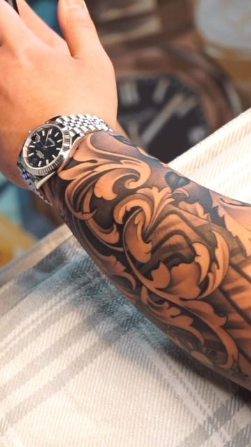 This forearm tattoo is all drama, with dark backgrounds and bright highlights making the filigres jump from the skin. Strong depth gives it a carved, almost sculptural look-perfectly suited for someone who enjoys tattoos with presence.