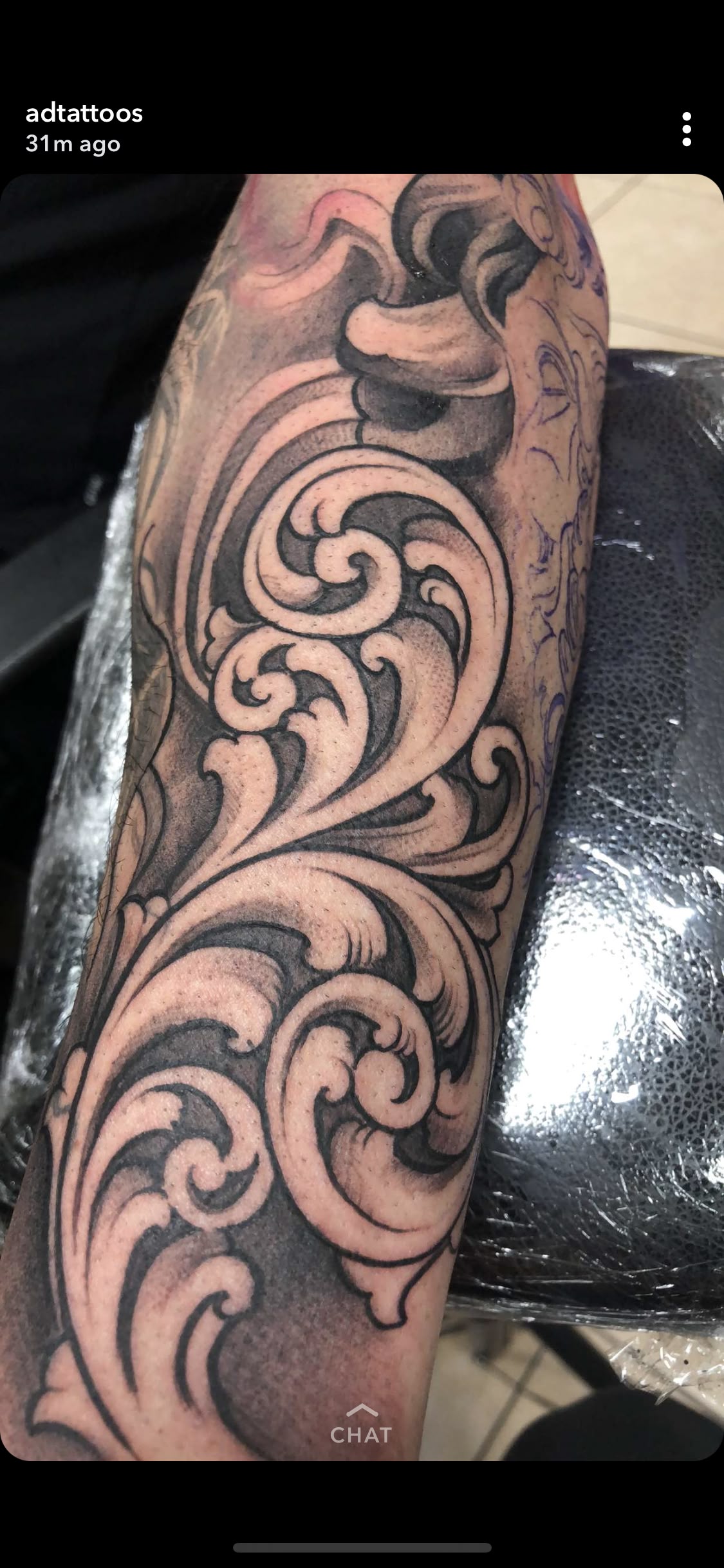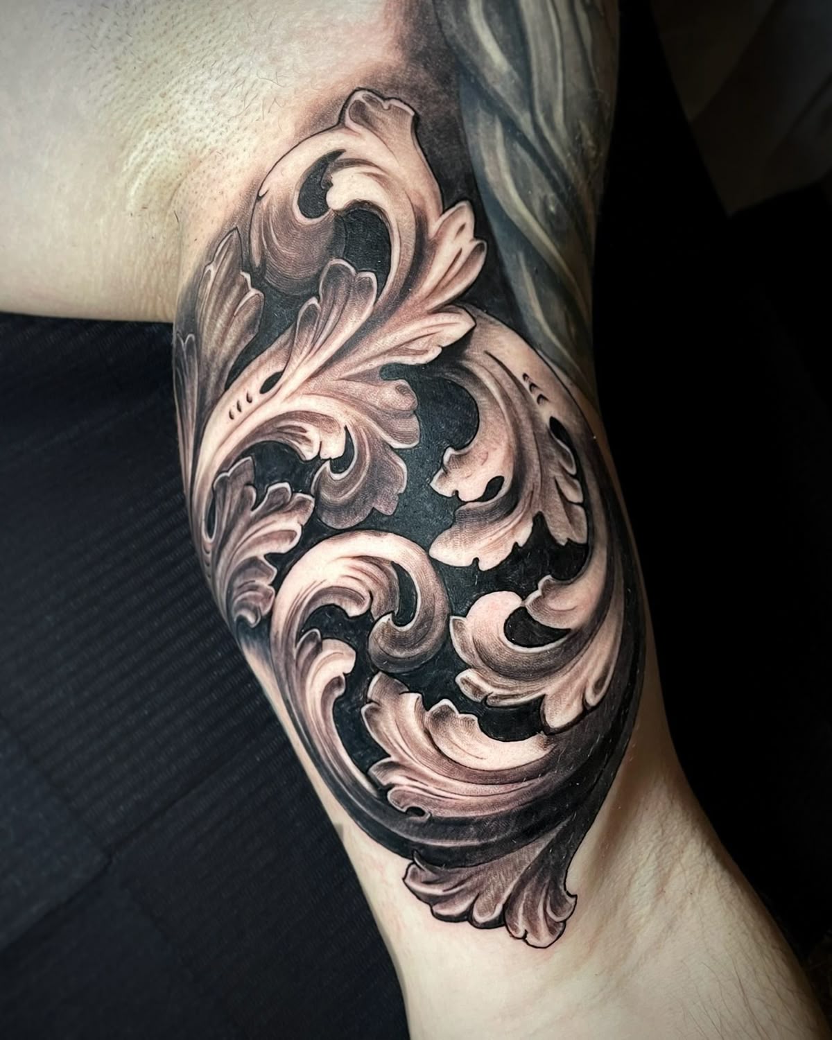This section of the tattoo feels very alive, with the curling filigree cascading over one another in a layered, sculpted style. The contrast between the dark ground and the light highlights makes it pop into dramatic presence almost as if it were some carved wood or metal.