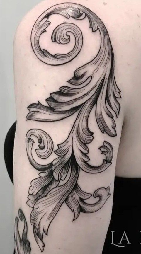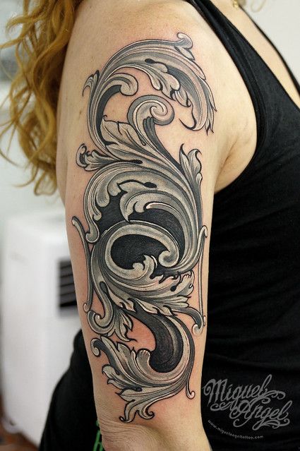 A classic filigree design focusing on curling leaves and sharply defined edges embodies this tattoo in ornamental design at its finest. With its crisp lines and delicate shading, this tattoo appears timeless-it could be an engraving carried on skin: