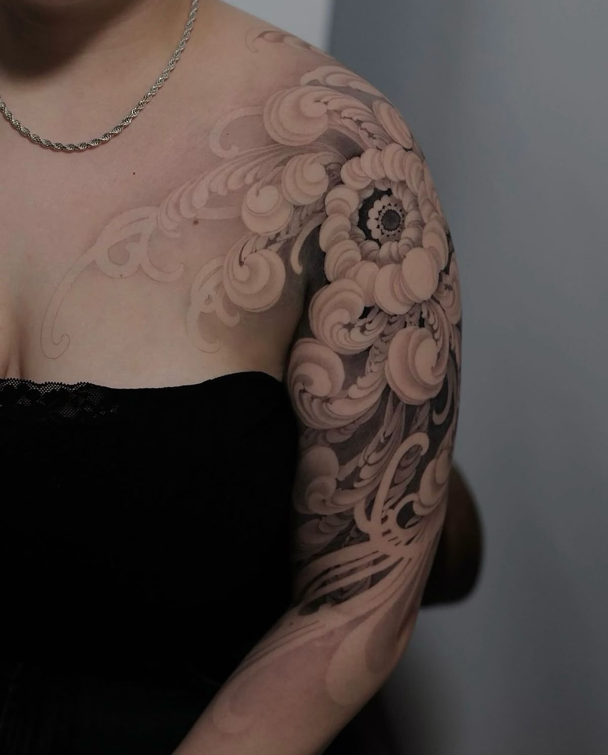 17. Soft Gradient Filigree Shoulder Tattoo