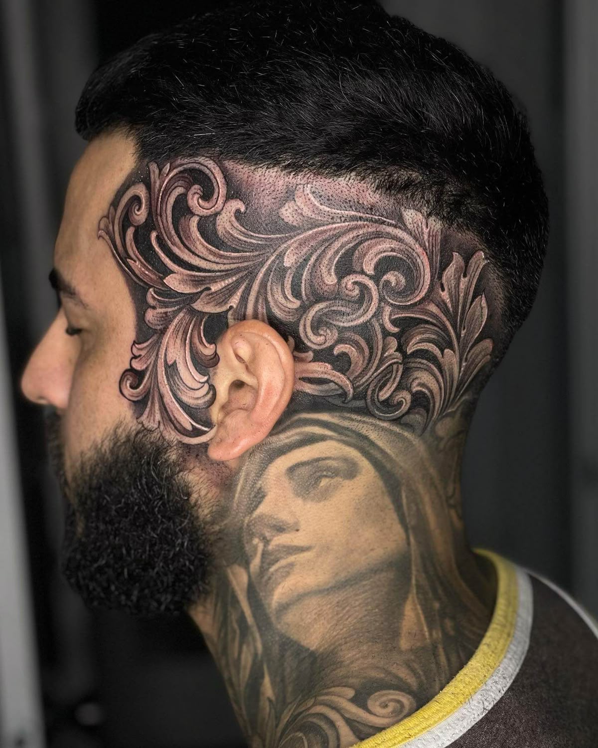 Head tattoos aren’t for everybody: it takes confident and somewhat exhibitionistic people. They look best when paired with a shaved style. This design is for those attracted to sharp-contrast artwork that combines the brute force of concrete and metal with ornate beauty.