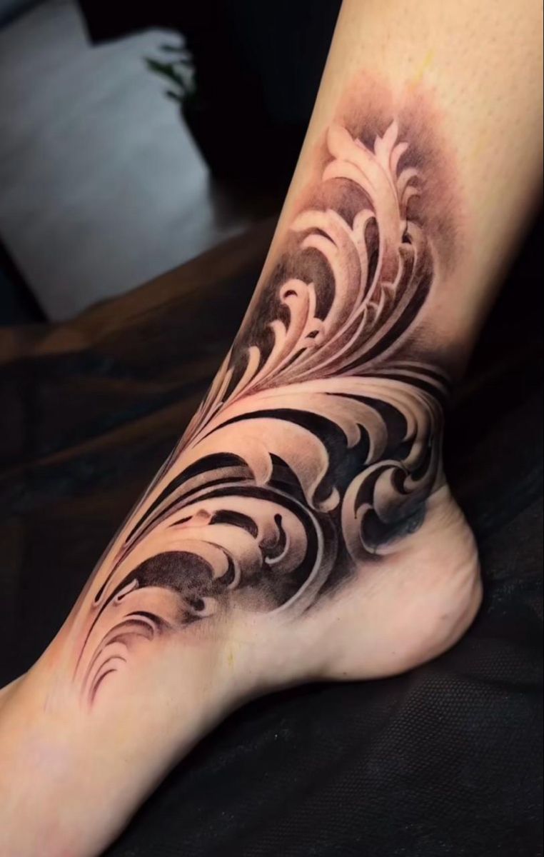 Flowing upward like flames or ocean waves, this ankle tattoo feels both powerful and graceful. The movement in the design gives it energy, making it one of those tattoos that feels alive rather than static. The soft shading around the edges makes it look like the pattern is emerging naturally from the skin.