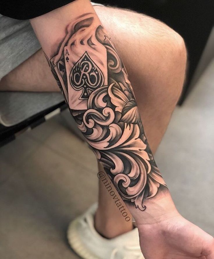 Here’s a tattoo that exudes mystery and charisma: the ace of spades framed by luxurious filigree. The card feels symbolic—maybe of luck, risk, or the thrill of taking chances—while the ornamental flourishes elevate it from a simple card to a refined piece of artwork. It’s a mix of boldness and finesse, making it feel confident without being loud.