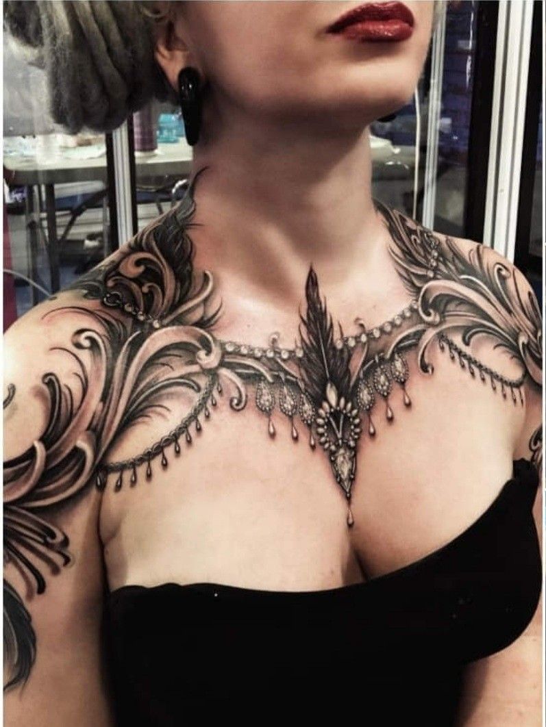 Chest tattoo necklace with an allure of gems spilling from above, while the filigree flourishes provide flow, and the drops of shading simulate jewels or beads. Somehow these are bold, feminine, and commanding, like inked couture jewelry on the skin.