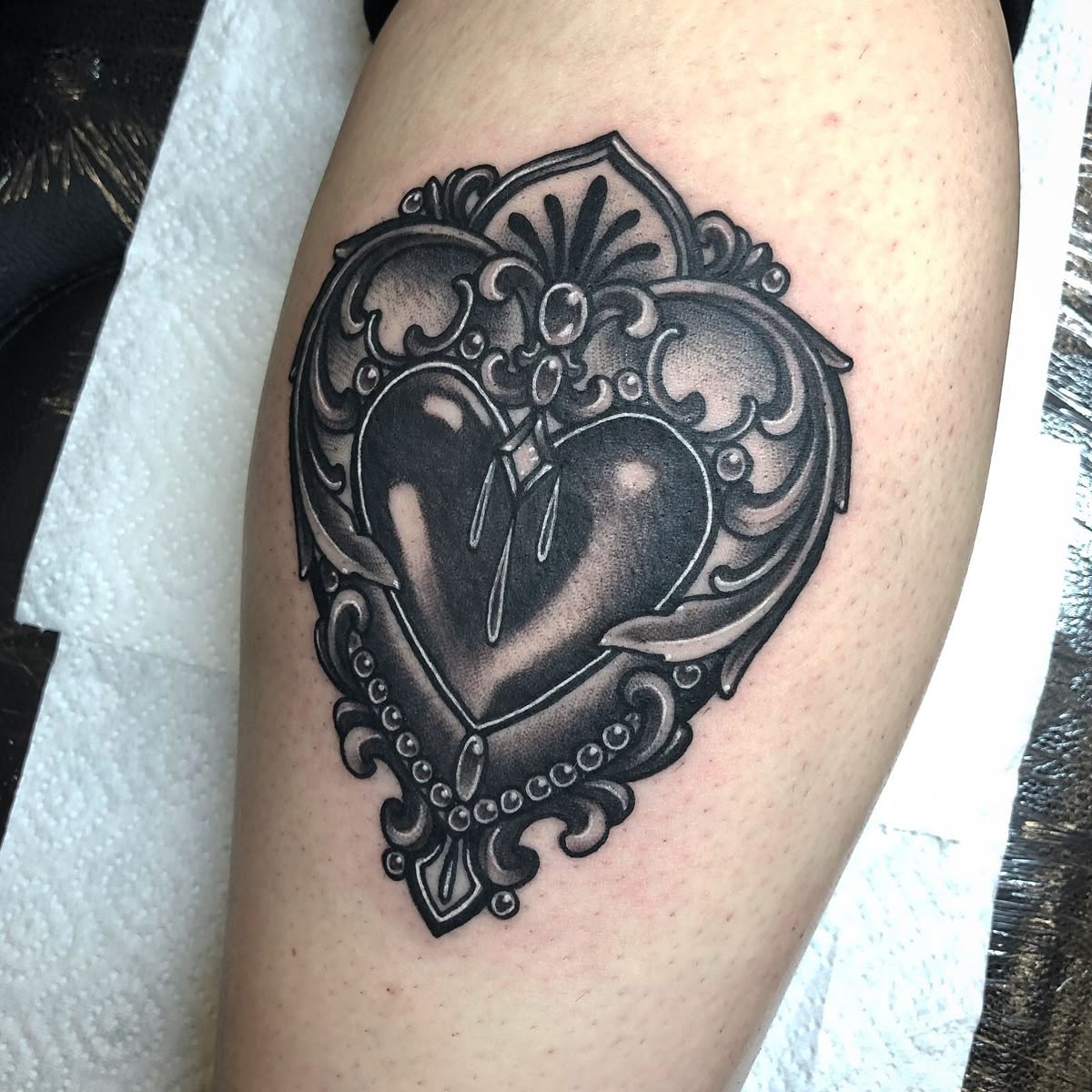 This filigree heart design feels romantic and rich, like an antique locket you might find in a treasure chest. The shading gives the heart weight and shine, while the ornamental frame turns it into a jewel-like centerpiece. Intimate and bold at the same time, the tattoo stands for both sentiment and beauty.