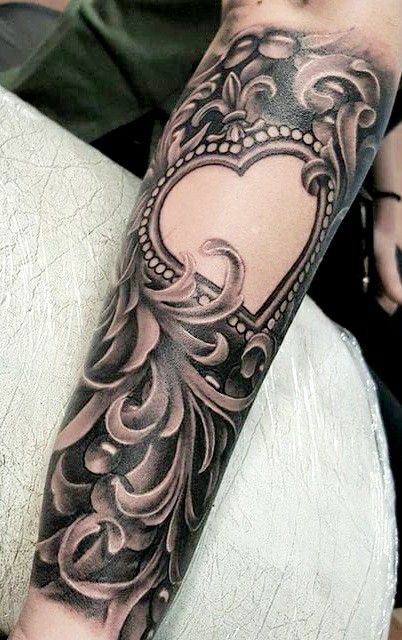 The tattoo frames a heart-shaped negative space with ornate filigree, turning absence into beauty. The detailed swirls feel like lace or a carved frame, while the empty center makes it versatile—it could stand for love, memory, or simply be enjoyed as sheer design.