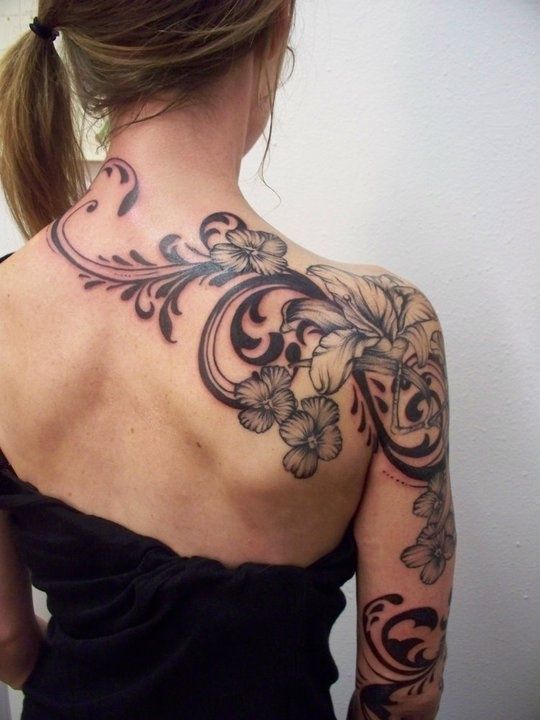 This tattoo would be perfect on anyone who prefers a decorative, understated tattoo design. The shoulder and upper arm location allow it to peek through clothing now and then, while the softness of the overall design makes it feel graceful rather than overwhelming.