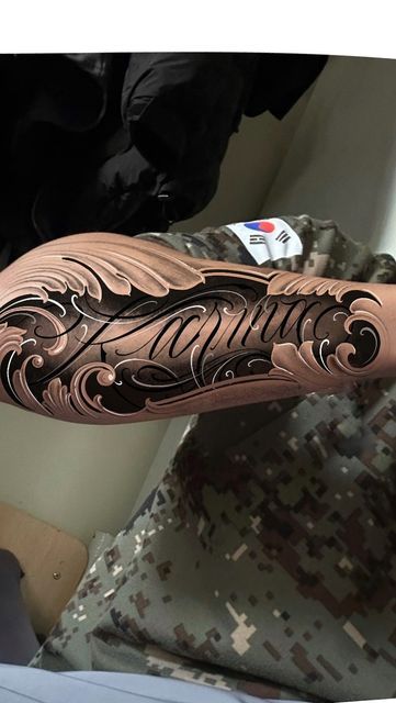 This is a tattoo where swirling filigree frames an elegant script, bringing words to life. The interplay between sweeping letters and stark ornamental forms makes it very personal, yet decorative. In effect, it expresses: “This word, this name, this phrase—it matters.” The filigree actually gives it weight and permanence rather than stealing attention away.