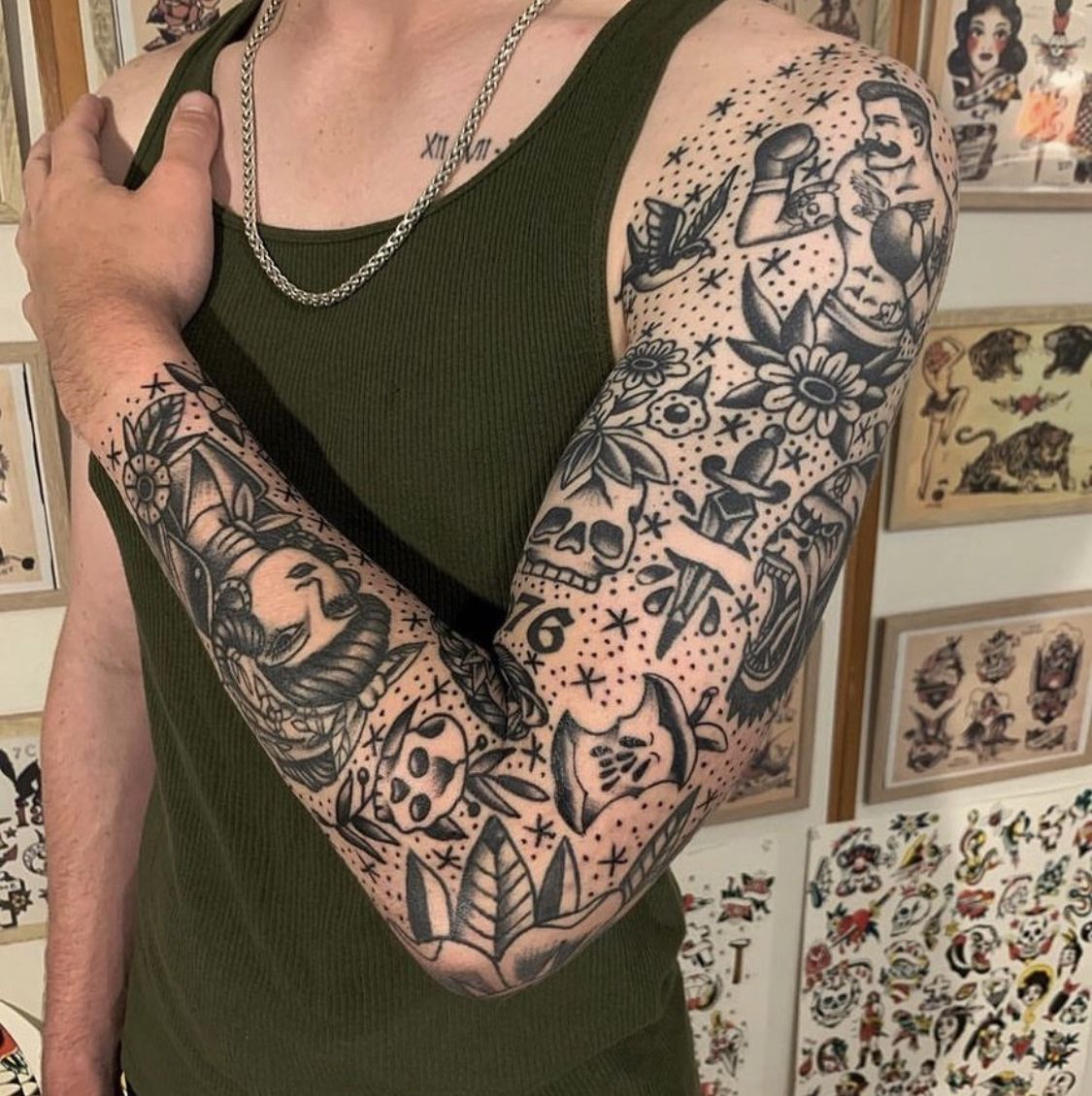 Compared with big single-image sleeves, a patchwork design like this is perfect if you want the freedom to add pieces over time. You can collect small designs from different artists, mix American and Neo influences, and use dots, stars, and mini motifs as stencil-like filler to pull everything together. It’s a great option if you’re not ready to plan a full scene but you know you want that arm completely covered one day.