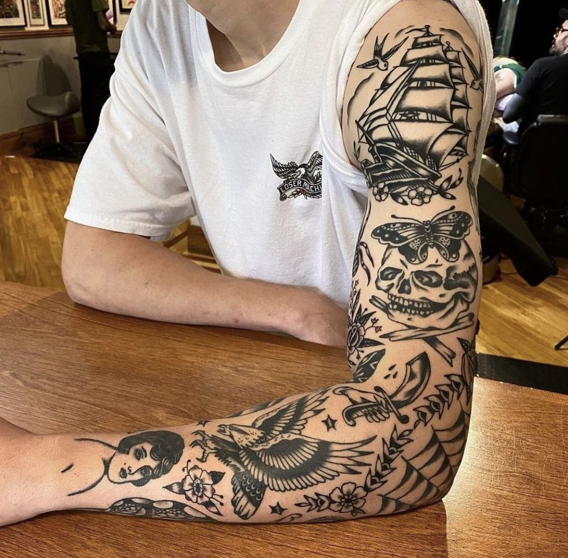 This sleeve feels like a whole old-soul adventure wrapped around the arm. The bold ship sailing across the upper arm, the skull, the moths, and the swallows all work together like a timeless American story told in black ink. It has that bold black work look that never feels too busy, just confidently packed with memories, risks taken, and a little danger. If you love traditional tattoo sleeve ideas that read like a sailor’s diary, this one has that storybook charm from shoulder to wrist.