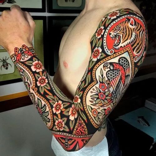 This sleeve looks like it was borrowed from an old Western playing card deck: a tiger, a bird, and flowers framed in ornate shapes with dotted borders. The warm color palette—gold, rust, sage, and black—gives it a folk-art feel, almost like embroidered fabric wrapped around the arm. It’s dramatic without being loud, a perfect unique American twist on traditional flash.