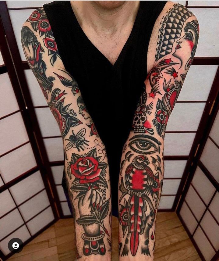There’s something so striking about a pair of arms covered in matching red and black traditional designs. Roses, eyes, birds, and skulls weave together into a dramatic, almost tarot-like story that feels both romantic and dark. It’s the kind of traditional American look that never apologizes for taking up space, and it suits anyone who loves a little Gothic flair without losing that classic flash-shop charm.