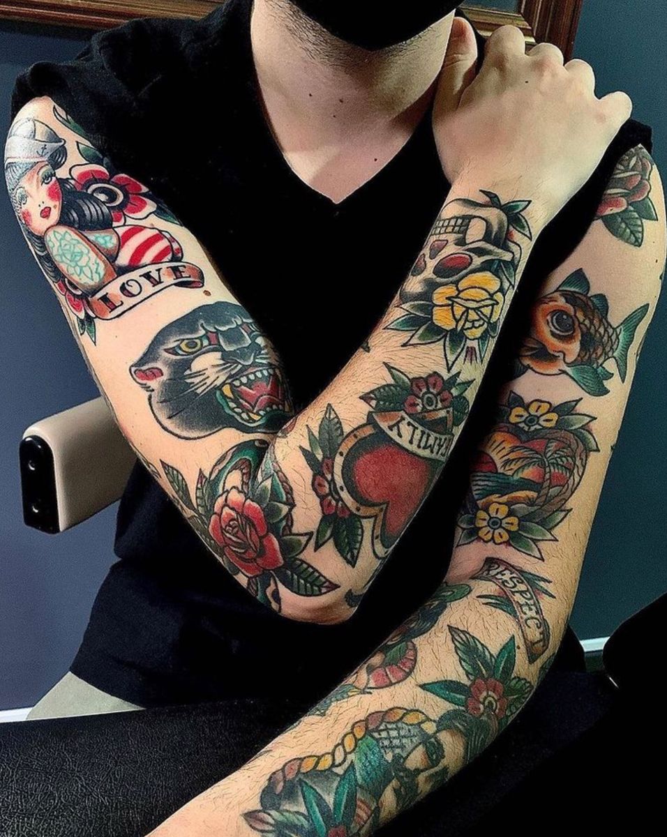The overall attitude here is unapologetically strong, which makes it perfect if you want your tattoos to say “I know who I am” before you even speak. The contrast of solid black work with clean color blocks keeps the design readable from any angle, and that mix of love-themed and animal motifs can be tailored to your own story. If you want a sleeve that feels like armor wrapped in flowers, this kind of traditional design nails that balance.