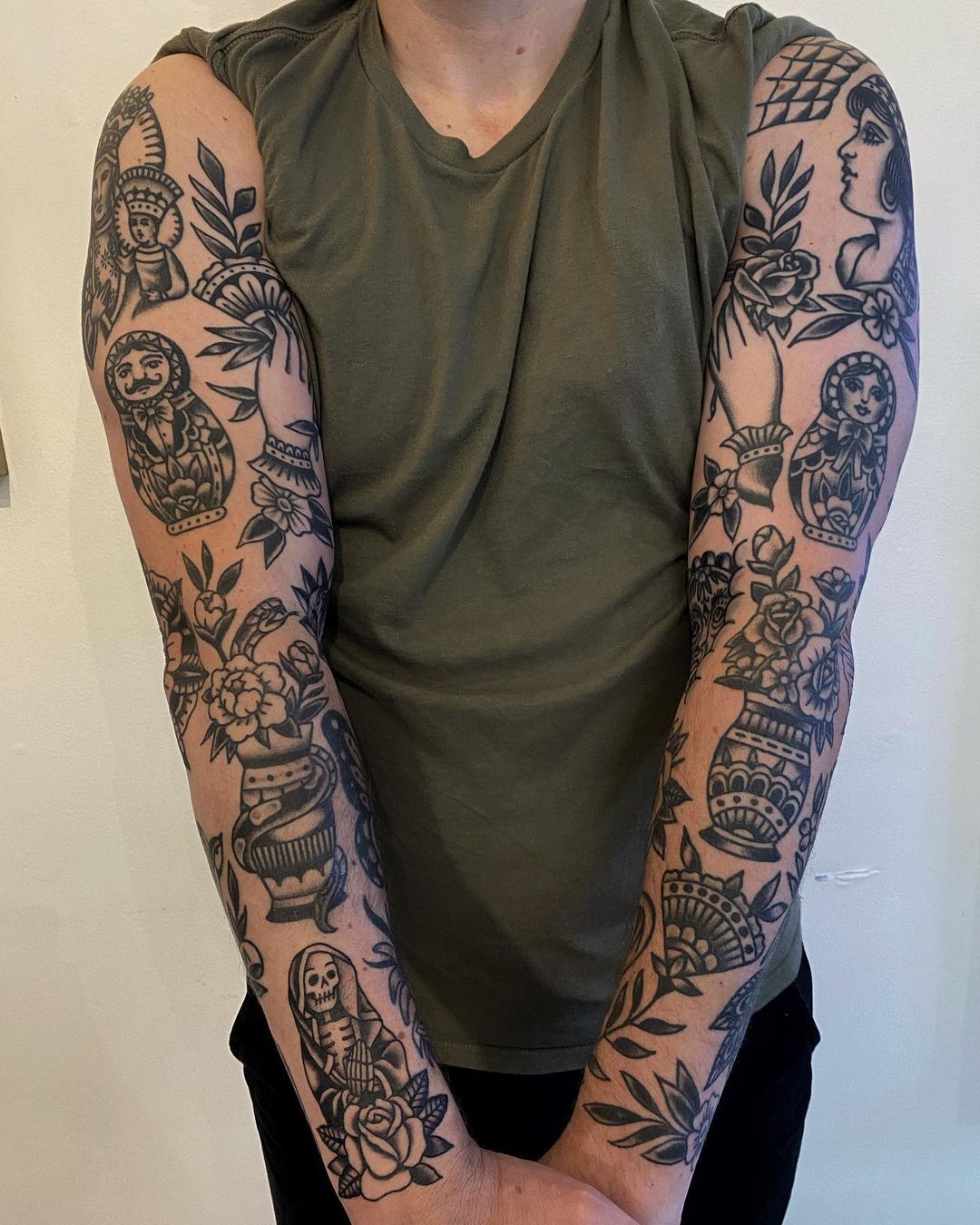 These twin sleeves feel like stepping into a tiny museum of folk art. Matryoshka dolls, vases, leaves, and flowers run up and down both arms in bold black work, each motif outlined with that unmistakable Black American confidence. The result is a calm, balanced patchwork rather than a chaotic jumble; like matching bookends, each arm echoes the other without being a mirror copy. It’s a traditional tattoo sleeve design with a softer, storybook twist.