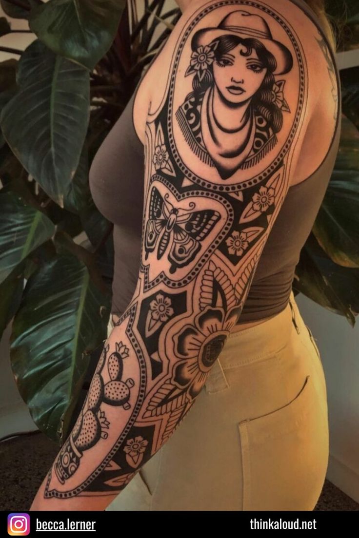 This sleeve is a love letter to Western iconography: a cowgirl portrait at the top, butterflies, flowers, and cacti all corralled inside thick black borders. The contrast between heavy black work and open skin gives it a striking black and grey graphic feel, almost like vintage lino prints wrapping around the arm. It’s both feminine and rugged, like a desert night in tattoo form.