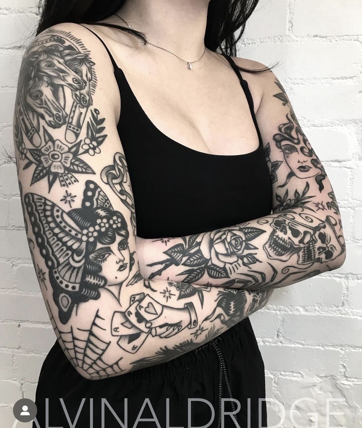 When it comes to a classic tattoo sleeve, it’s not only about the skulls, the roses, or the colors you choose—at the end of the day, it’s about how you want to feel when you look down at your arm. Is it something dark and protective? Maybe light and girly? Or a blend of Western grit with soft flowers? Keep in mind that this is walking, growing artwork, and your feelings might shift with every passing day. There’s no rush—collect your thoughts, communicate with your tattoo artist, and create a design that you can live with. You will know it’s the right piece when you can’t imagine your body without it.