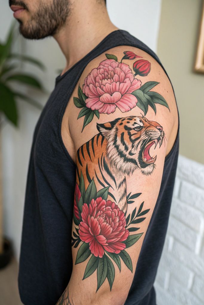 If you are considering a traditional tattoo sleeve but are a bit apprehensive about the commitment, a tattoo like this would be a great place to start. You can wear this tattoo on its own as a bold statement or as a starting point to a full sleeve tattoo, adding more flowers, fine-line leaves, or black and gray filler. The tiger serves as a reminder for you to be confident and embrace the strength and softness you possess.