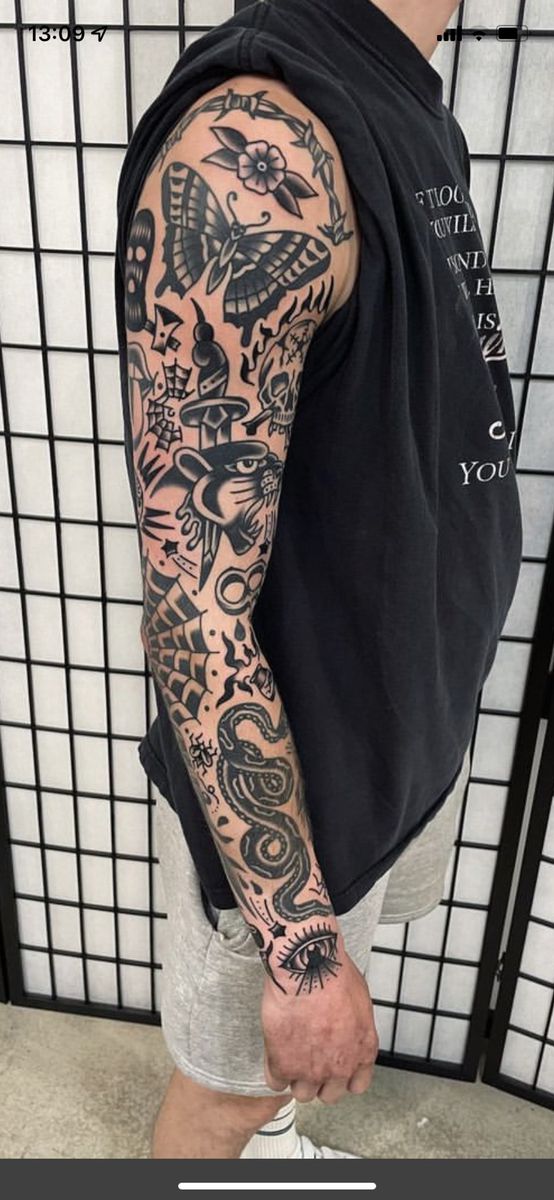 This sleeve feels like a whole scrapbook of classic American flash: hearts, strawberries, butterflies, stars, and little faces all dancing together down the arm. The solid black outlines and minimal shading give it that bold black and white vibe, and the generous use of open skin keeps everything light and breathable instead of dark or heavy. It’s playful, nostalgic, and a little girly without losing that tough outer shell.