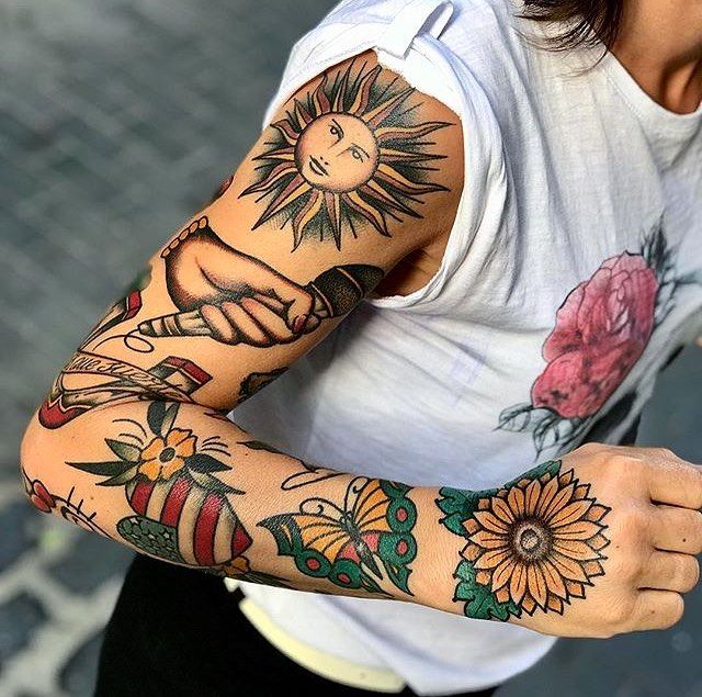 This sleeve radiates optimism from every angle: a serene sun on the shoulder, a handshake frozen mid-promise, and bold sunflowers and classic striped hearts wrapping the forearm. The warm color and solid black outlines give it that unmistakable American flash vibe, but the cheerful imagery keeps it light and playful. It’s the kind of traditional tattoo sleeve that makes you look like you carry your own daylight around, even on gray mornings.