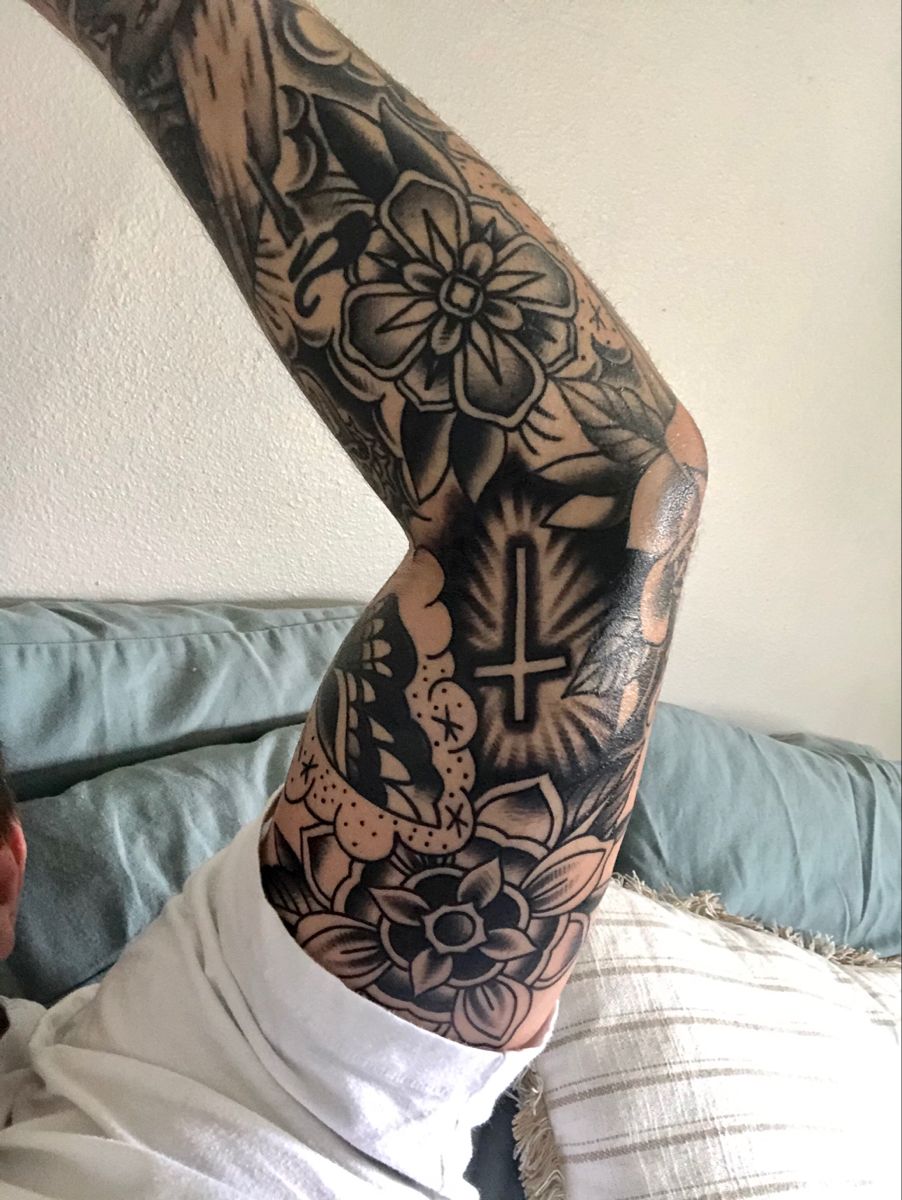 This inner-arm sleeve proves how powerful pure black and grey can be. Large flowers, bold petals, and a glowing cross shape sit on a field of soft shading that almost looks airbrushed. It has that contemplative, slightly Gothic mood—strong but peaceful at the same time—like a private little garden of symbols that only shows when you stretch or reach.