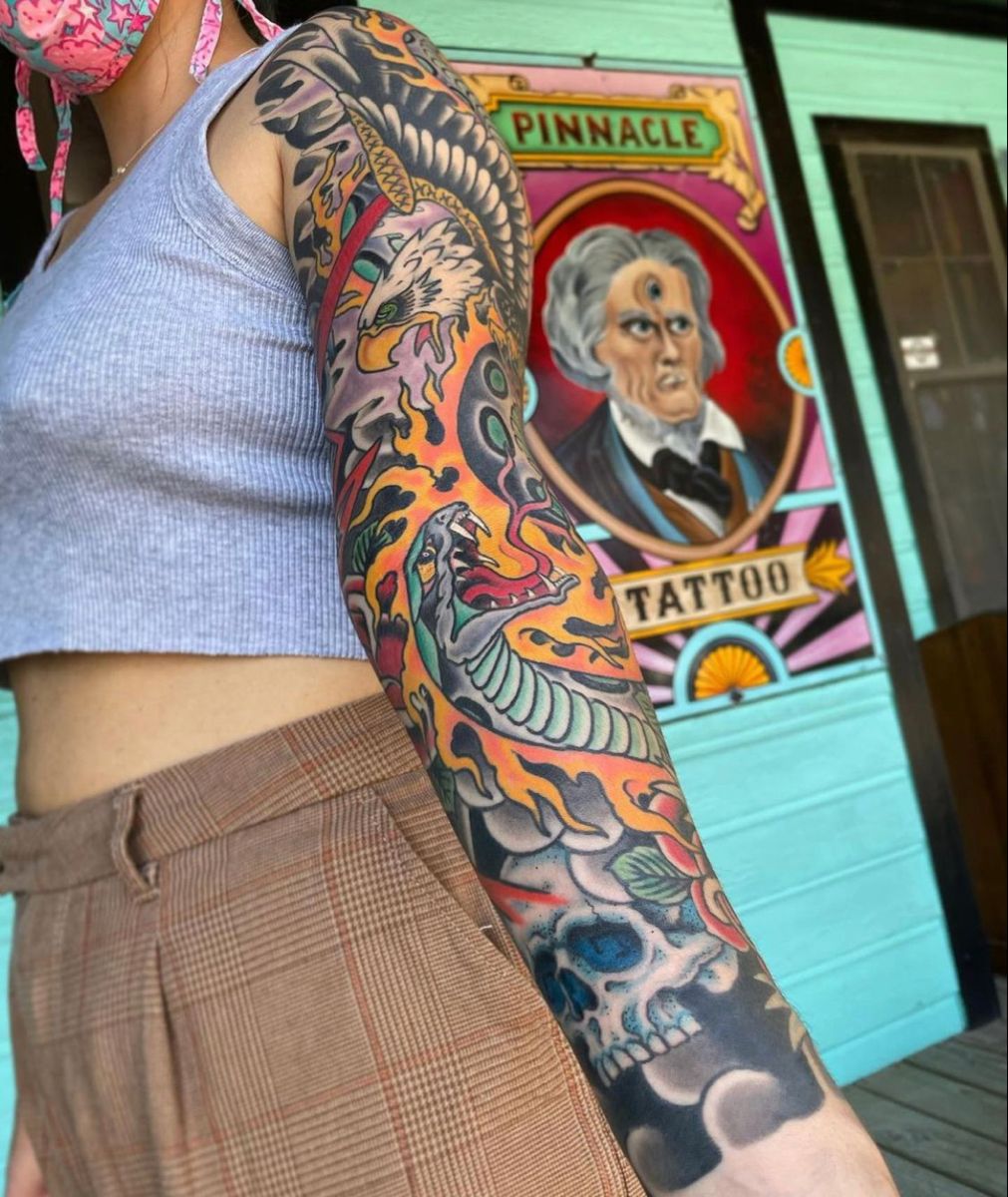 This sleeve feels like pure motion, from the sweeping wings of the eagle to the twisting serpent and skull disappearing into clouds of fire. The saturated color, heavy black shadows, and swirling shapes create a true Neo take on traditional, like an old flash sheet turned up to full volume. It has that dramatic, almost cinematic energy that makes the arm look alive, perfect if you love a dark, slightly chaotic story wrapping all the way from shoulder to wrist.