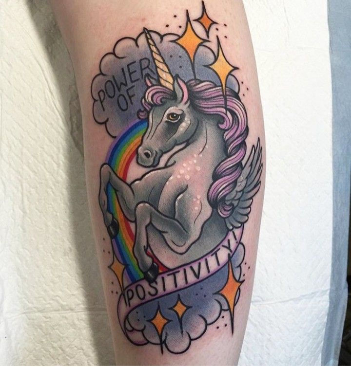 This powerful calf ink squeezes all the things we love about unicorn tattoos into one statement: a winged unicorn breaking out from behind a cloud, with a rainbow and sparkly stars, all tied up in a “positivity” banner. The modeling of the body in shading is very convincing, and that bright color and lettering lean into that traditional American poster look. And it’s not small: it’s big and unapologetic and, well, just wonderful, a walking version of wearing your favorite inspirational quote crossed with something far more stylish.