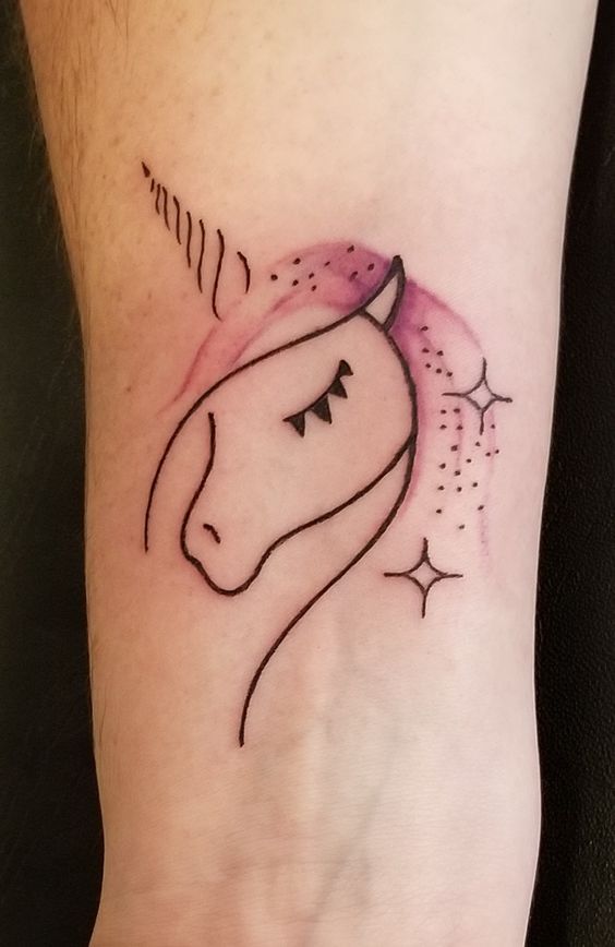 This dreamy unicorn profile could almost be drawn with a single stroke when you’re not looking. The closed eye, the gentle curve of the neck, and the halo of mauve color around their head impart a peaceable, meditative feel—like perhaps the unicorn is mid-wish. There are also a few sparkles that float about the horn, imparting just enough whimsical magic without tumbling too far into full-on cartoon territory. It’s a pretty choice if you’re into minimalistic, black and white tattoos but still want a dash of color to spice things up.