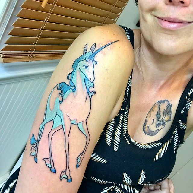 This tall, slender unicorn immediately brings Amalthea, the storybook unicorn, to mind—elegant, reserved, and just a little mysterious. Soft blue shading fills the body and mane, while fine black outlines trace those long legs and delicate hooves, giving the whole design a dreamy, realistic-meets-illustration feel. It’s the kind of tattoo that looks like it could step right off your upper arm and onto a misty hillside somewhere in Scotland.