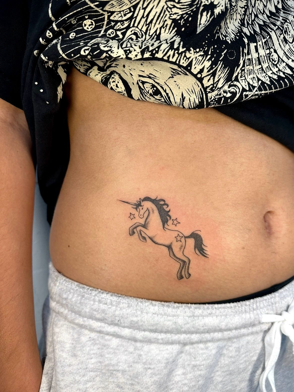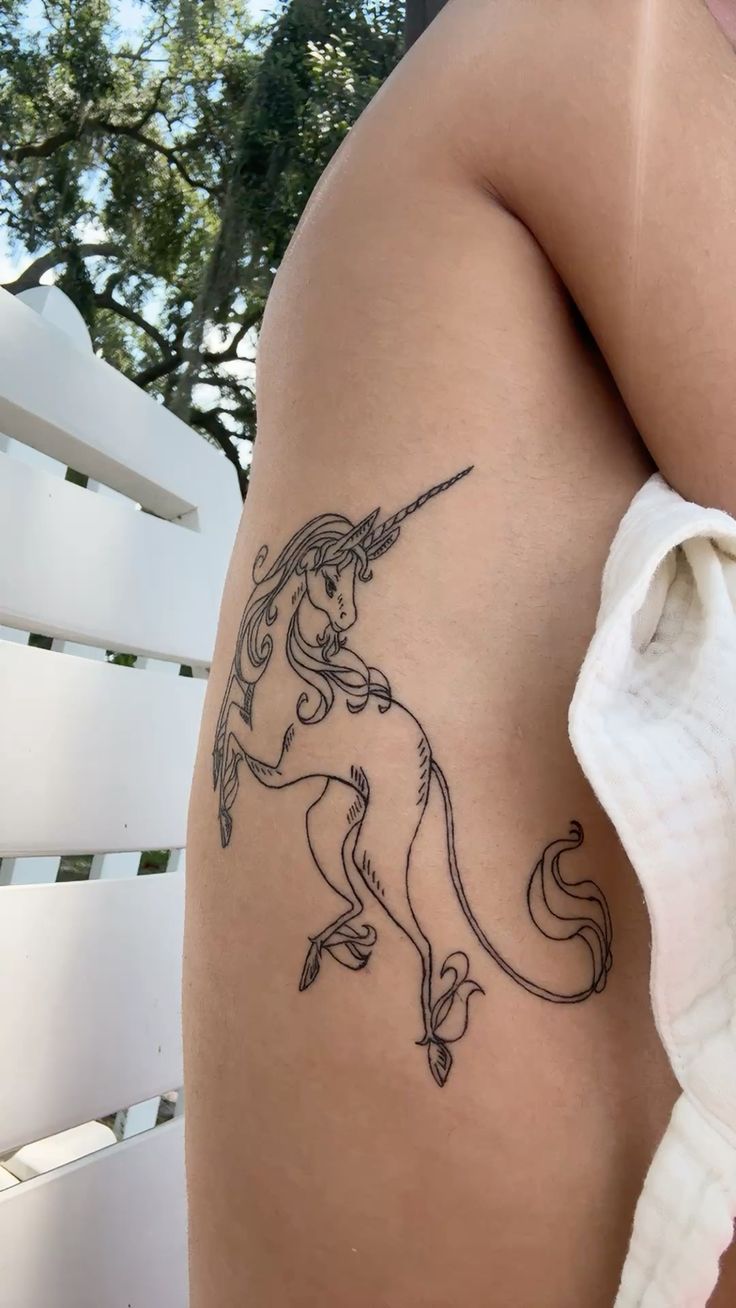 This type of tattoo is perfect for women and men who want small, minimalist unicorn ideas that will complement an on-the-go lifestyle—no heavy color to heal, not too fussy. It’s flattering to all body shapes as it skims the line of your hip and stomach. For those who love tattoos because of what they represent more than how they look at work, this small side piece is the simplest way to wear a personal signifier of strength and freedom on—listen up, this is gonna seem small, but stay with me here—your person.