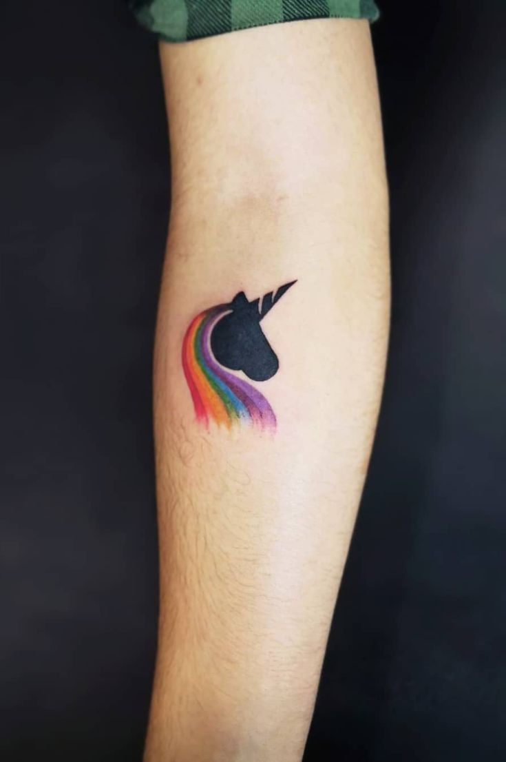 This concept is ideal for both women and men who desire a little, simple tattoo that easily reveals itself from afar. It looks especially good on the forearm, seeing how the run length of the Rainbow mane follows your arm’s line! If you want unicorn tattoo ideas that are easy enough as your first but bright and new so you won’t outgrow them right away, a bold silhouette is an ideal compromise—and this one won’t cover up your whole arm.