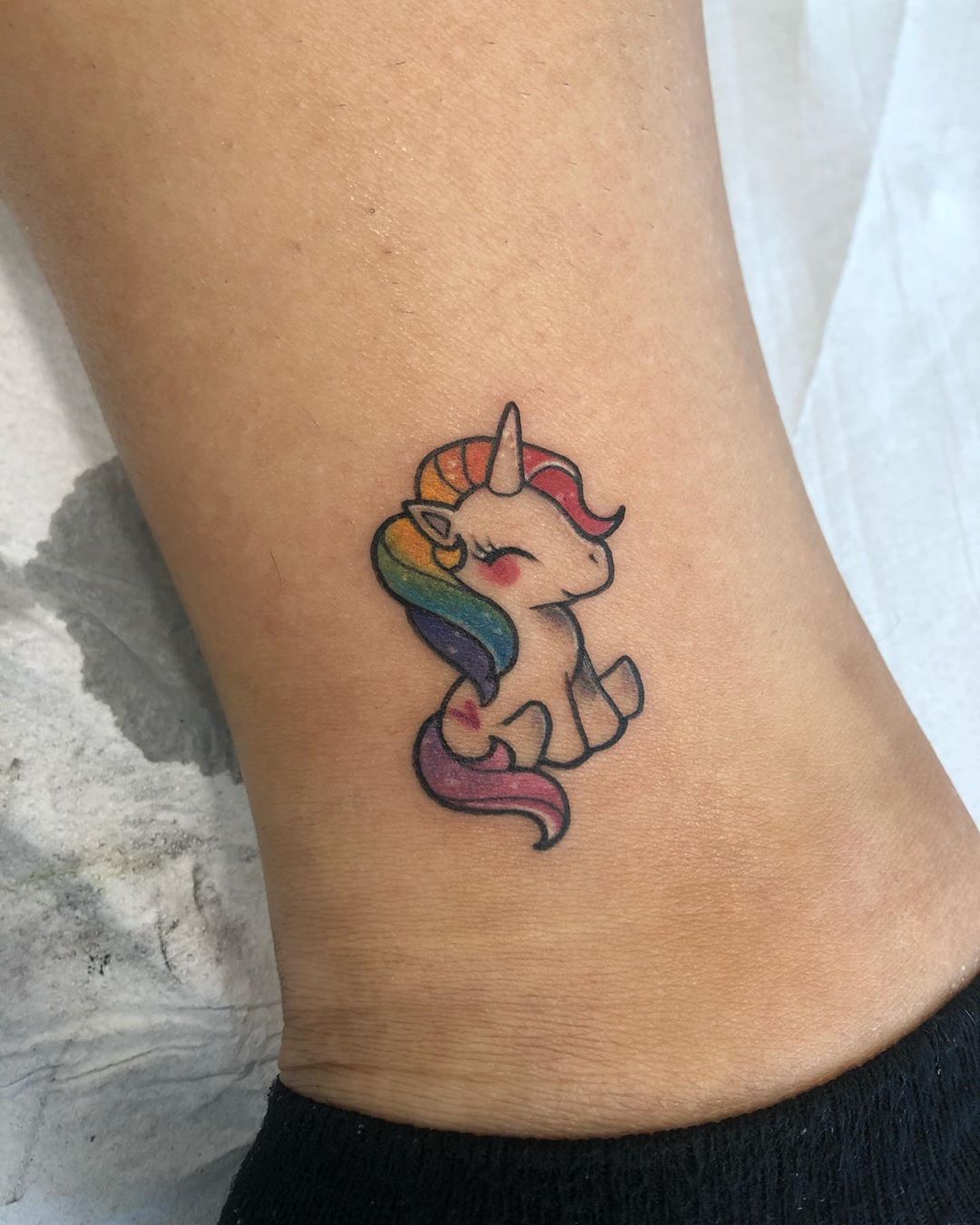 18. Tiny Rainbow-Mane Unicorn Ankle Tattoo