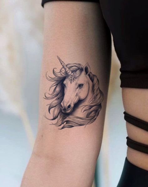 This unicorn portrait is like Amalthea, the mythical unicorn, but all grown up and getting ready for the real world. The full mane, gentle muzzle, and piercing stare all conspire to give it an overwhelmingly real, even cinematic presence; it is the creature that dumbly watches over your everyday life without you even knowing it. And because it’s rendered in slick black-and-white, it reads less like a cutesy fantasy accessory and more like an actual powerful spirit animal—key when you want your tattoo to whisper “strength and grace” rather than scream “glitter.” It’s one of those designs you stare at a little longer every time you pull your sleeve up.